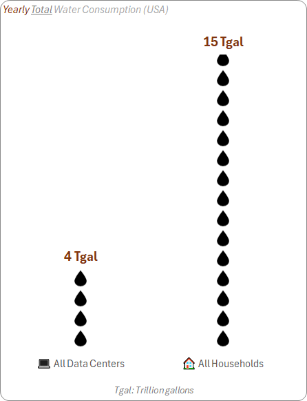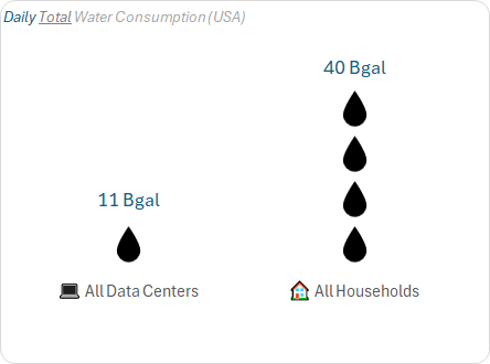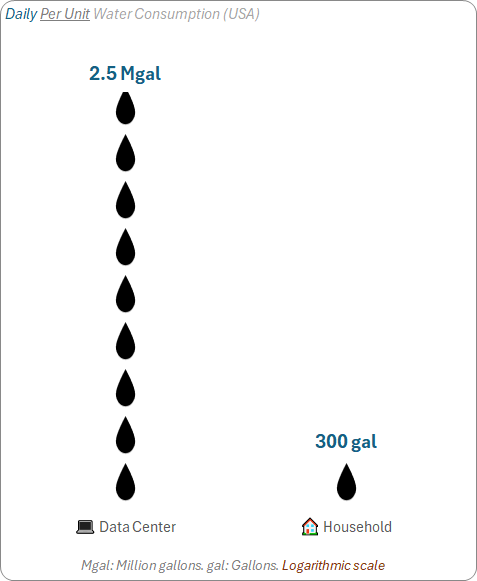 - The average U.S. household uses roughly 300 gallons/day — less than 0.01% of a hyperscale DC’s peak usage.
