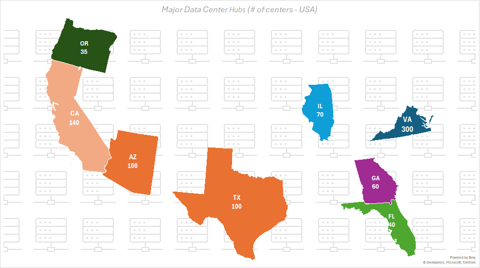 - Virginia (especially Northern Virginia’s “Data Center Alley”)