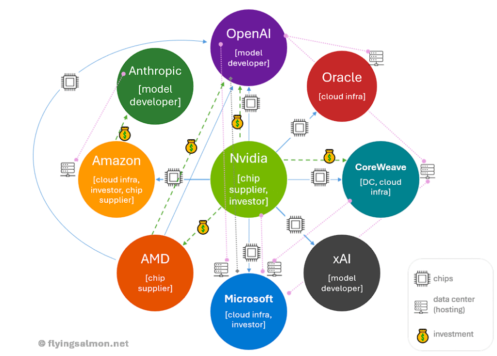 Take Nvidia, for example: it invests in OpenAI, which in turn buys Nvidia chips. Nvidia also backs CoreWeave, a cloud provider that rents GPU capacity to OpenAI and Microsoft; both of whom buy Nvidia hardware. Meanwhile, Oracle builds data centers for OpenAI using Nvidia chips, and AMD gives OpenAI equity warrants worth $34B, incentivizing chip purchases from both AMD and Nvidia.