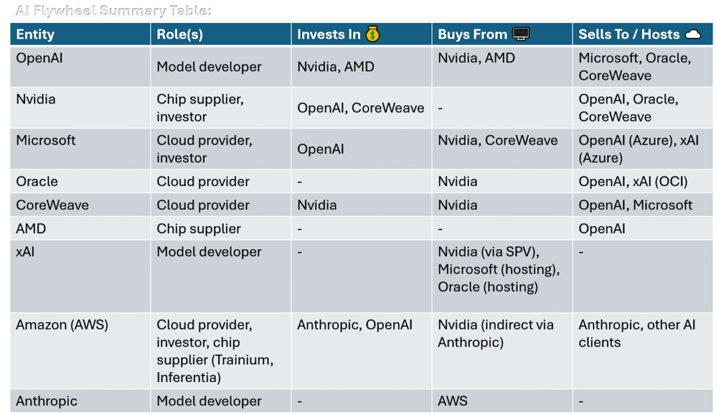 These entities are not just trading chips; they’re trading influence. Microsoft has invested $13B in OpenAI, licenses its models, and hosts them on Azure. Amazon, while building its own AI chips (Trainium and Inferentia), invested $4B in Anthropic, which runs on AWS infrastructure; often powered by Nvidia GPUs. Even xAI, Elon Musk’s model developer, buys Nvidia chips via special-purpose vehicles and hosts on Azure and Oracle.